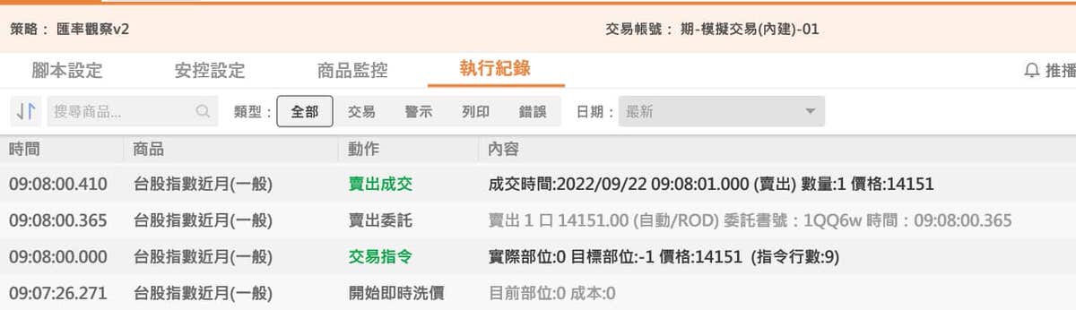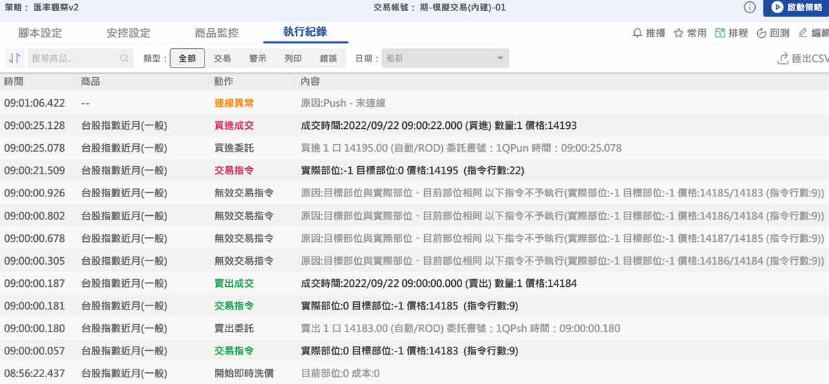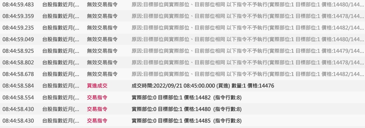 將邏輯分成主要跟次要,要先符合主要邏輯然後在執行次要邏輯,這樣的寫法基本上對了,但還是有可能出現無效交易指令的訊息,如下面範例的寫法,即使開了逐筆洗價,這些函數的最小時間單位似乎為1秒,所以就算進場後馬上成交,但如果那一秒還沒結束,而價格仍然在變動,在逐筆洗價的狀況就會出現出現無效交易指令的訊息,如下圖,09:00:00.187 雖然成交了,但後面成繼續出現無效交易指令的訊息