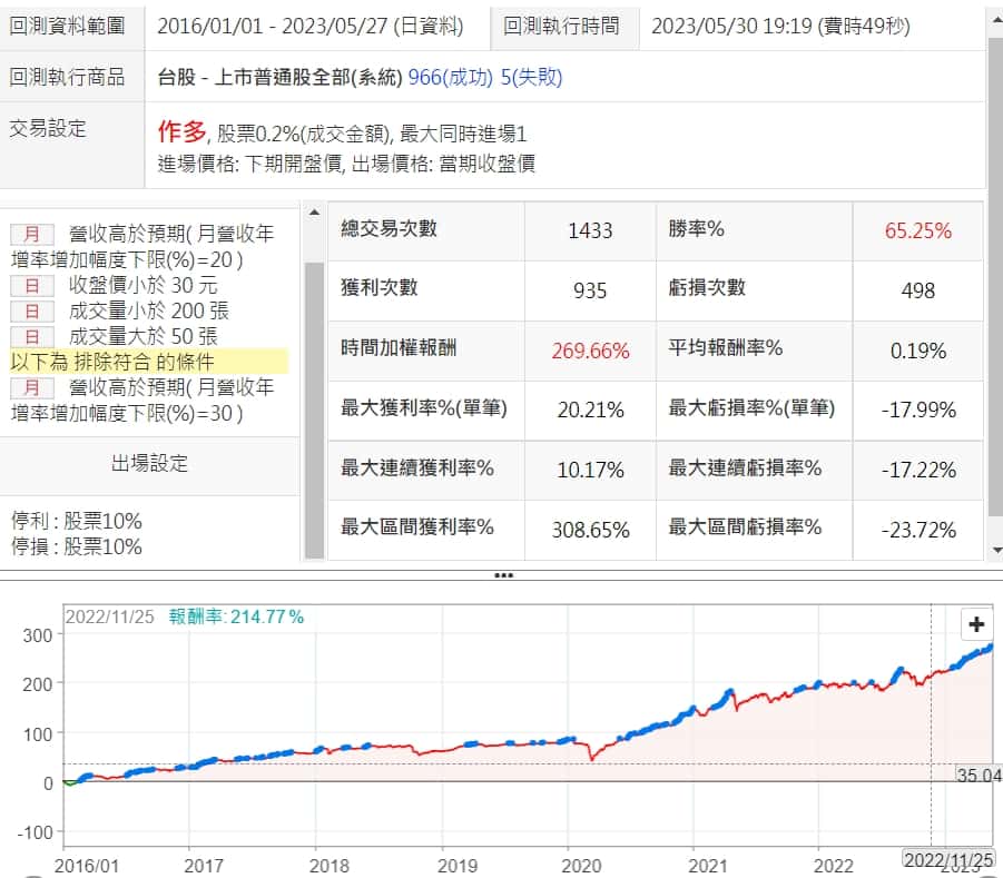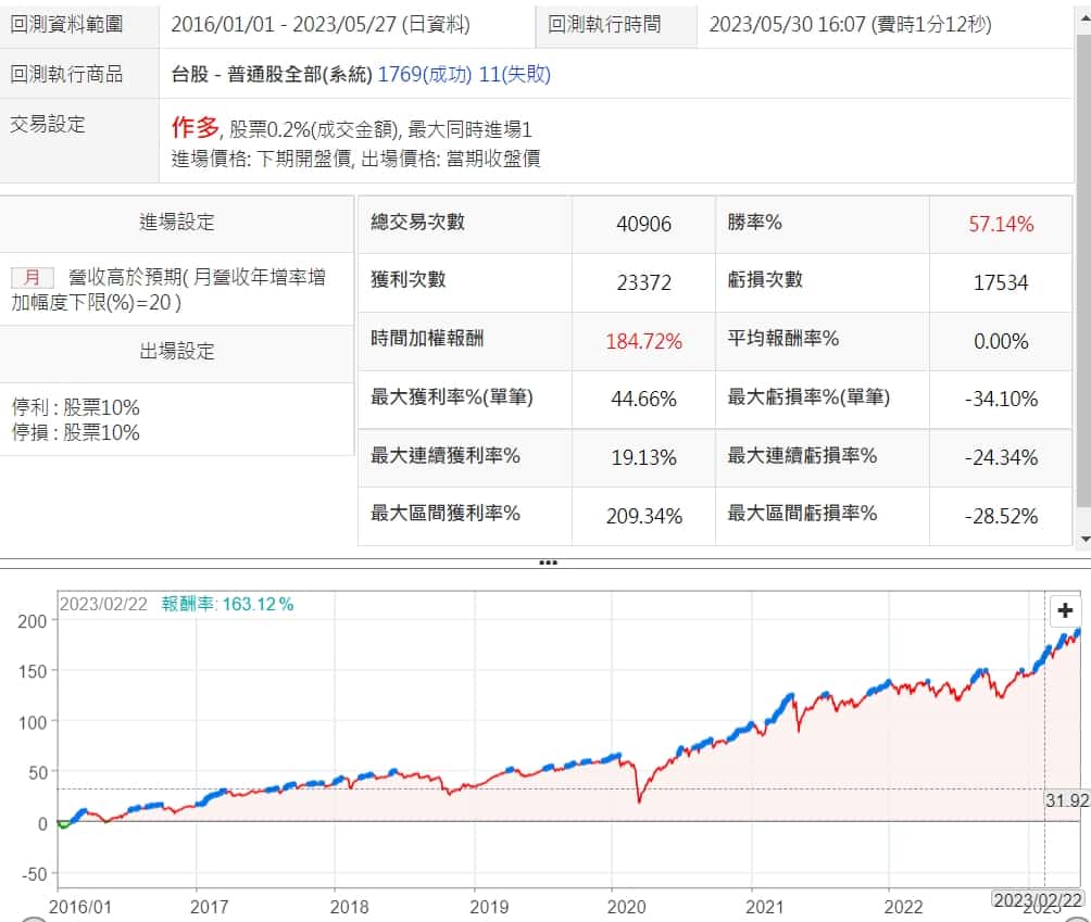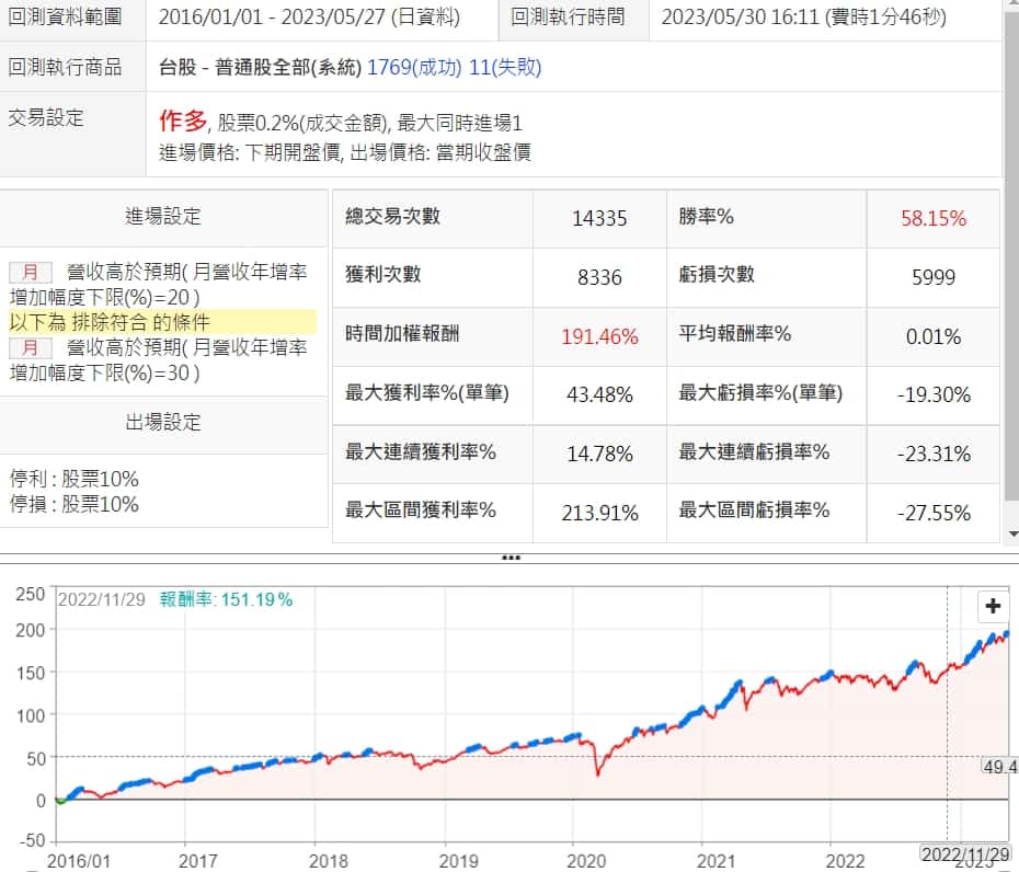 這邊將月營收年增率限制在20%~30%之間,一方面降低交易次數,另一方面,也能提升一點勝率跟報酬率
