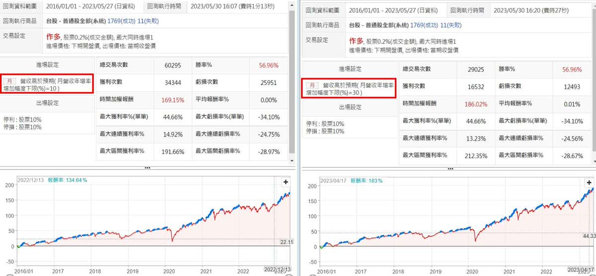 比照前一個策略的作法,比較不同月營收年增率的表現,這邊採用月營收年增率大於10%跟30%來做觀察,表現都是差不多的,