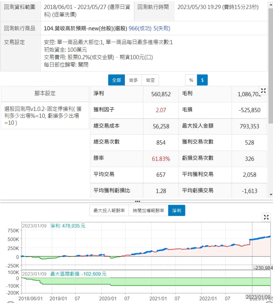 用營收高於預期策略原本預設值+停損利10%來做回測,表現跟前面幾個用營收當條件的策略都很相近,報酬率一路往上,勝率也都在五成多,交易次數也多