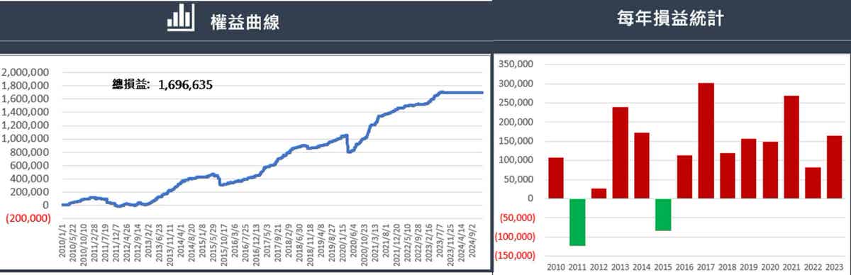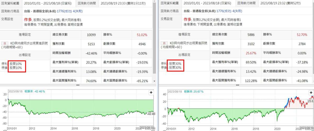 以下原本策略的回策,停損利為10%跟30%,回測從2010年開始,報酬率幾乎是一路向下,停損利為30%那組(右圖),表現有較好,但仍不是非常穩定