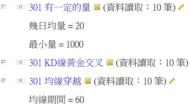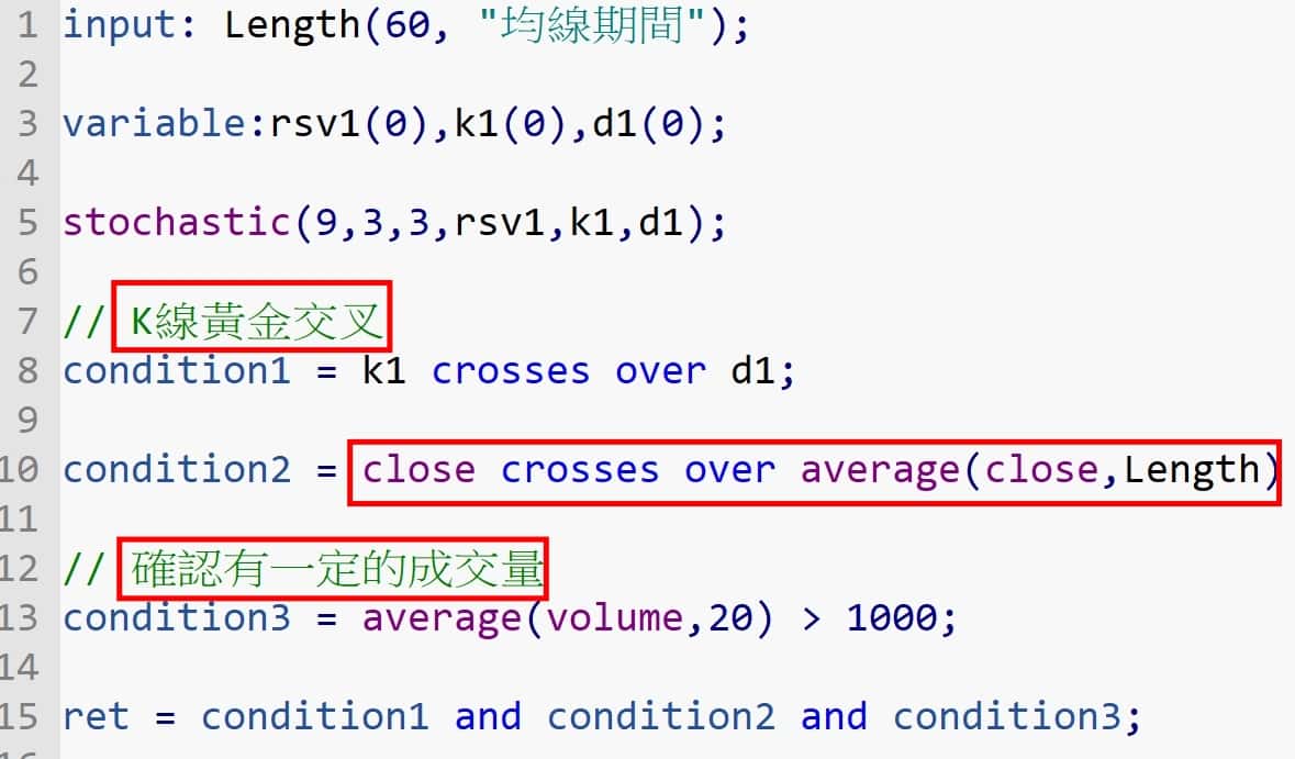 重新檢視內建策略程式碼,發現裡面包含了三個條件,KD黃金交叉、均線穿越、以及最小成交量條件,但三個條件,只有一個條件有參數可以調整,其他都是固定數值,在做回測時,如要調整參數會很不方便,而且,根據經驗,均線穿越這個條件,用在月線上效果會較好,所以三個條件,放在同一腳本,又包含不同頻率,有問題時不容易偵錯