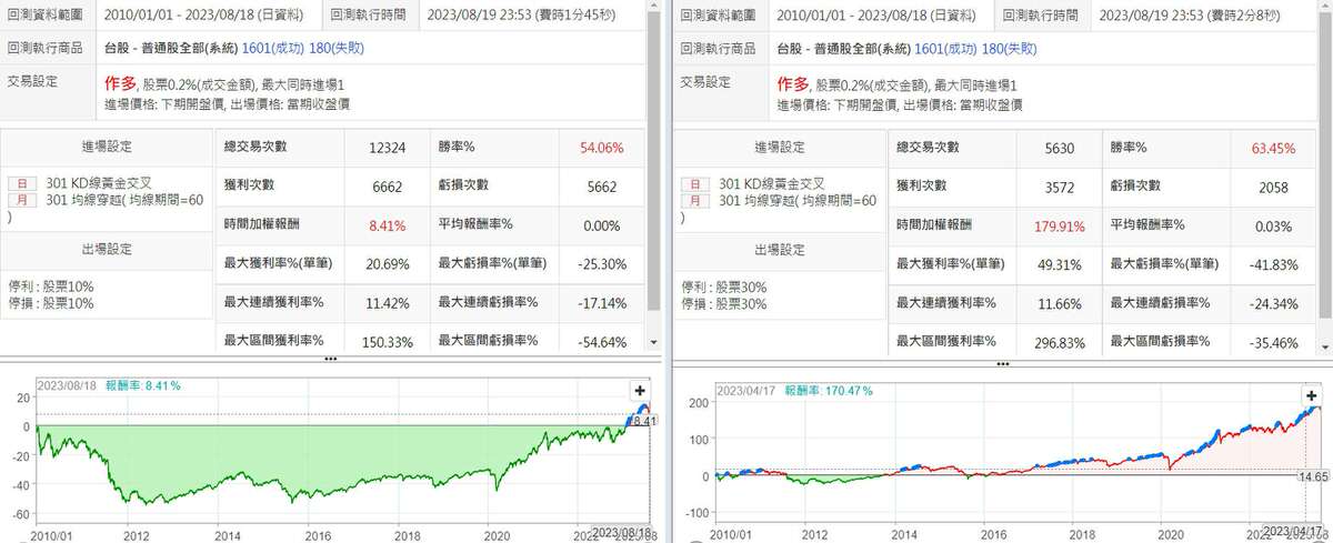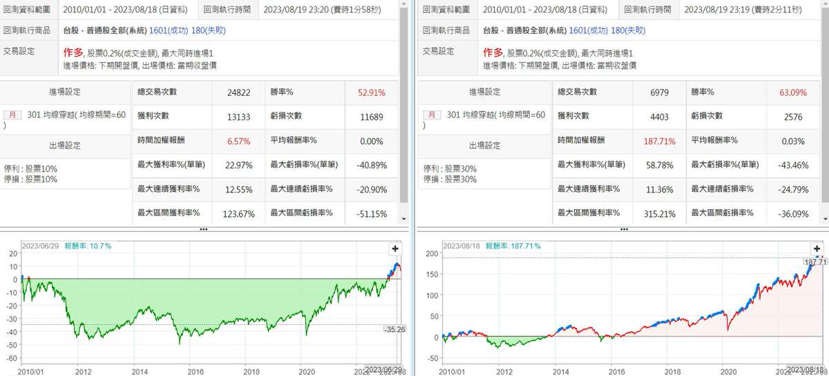 這邊只使用月均線突破60個月為條件,停損利為10%跟30%來做回測,從下圖可以看出,當停損利設為30%時(右圖),績效已經大幅翻轉,獲利趨勢向上,而停損利10%那組,看似表現不佳,但實際上也算是有向上的趨勢,雖然後來只要一點點正報酬,但其主因是在2010、2011這兩年,有較大虧損所造成,如果從2012年開始回測,績效應該會好看許多,不過,不管如何,績效都是比原本的好多了