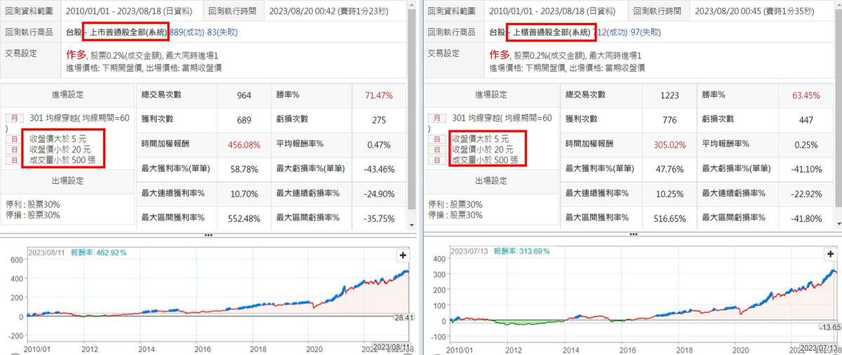加入我們平常都會用的價格與成交量條件,價格限制在5~20,成交量小於500張,並且將上市股跟上櫃股分開回測,勝率從最原始策略只有接近五成,且總報酬幾乎都是負的,變成勝率突破七成,且總報酬率一路往上