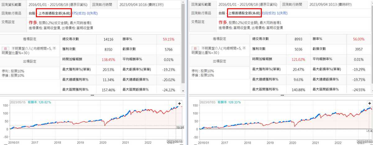 將上市櫃股分開回測,感覺上績效差異不大,等後面增加其他參數後再分開試試