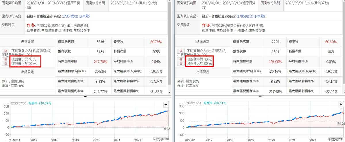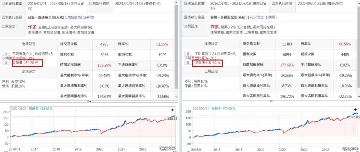 將價格限制在20跟50以下回測,勝率都提升到60%,表現也一樣都差不多
