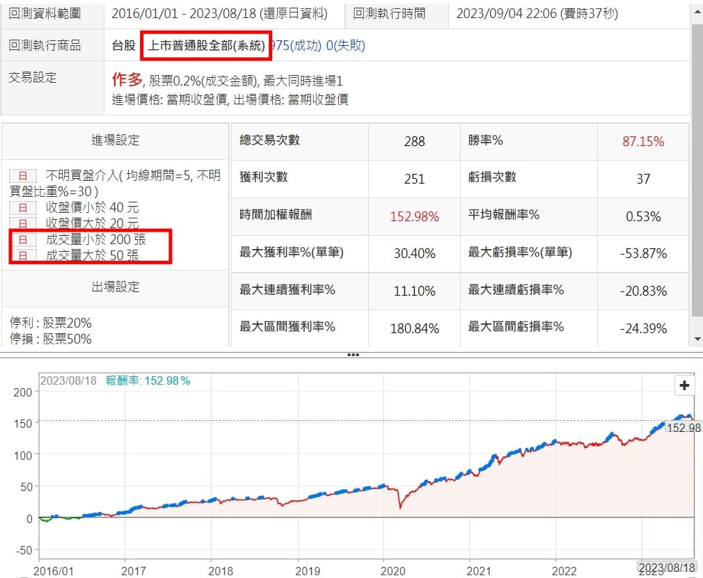 將成交量限制在50~200中間,且只用上市股,再來就是停損利比較特別,停利20%,停損50%,之所以這樣設定,是因為202003的時候,這個策略會有很多股票虧損出場,因此,故意將停損放大,而這樣的結果就是勝率非常的高,交易了288次,虧損只有37次