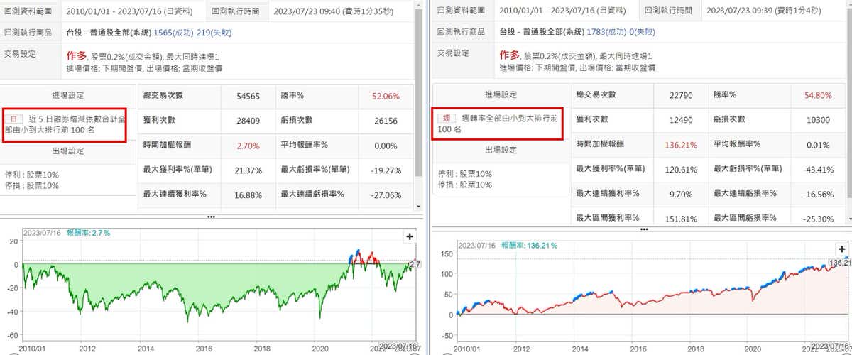 既然回測告訴我們,用由大到小排名的方式是不行的,所以我就想,那由小到大不知行不行呢? 下圖為回測結果,跟上面是不是有很大的差異呢? 尤其是使用了周轉率由小到大排行前100這個條件(下圖右),績效整個翻轉過來,用這樣的條件去優化,不是更好更輕鬆