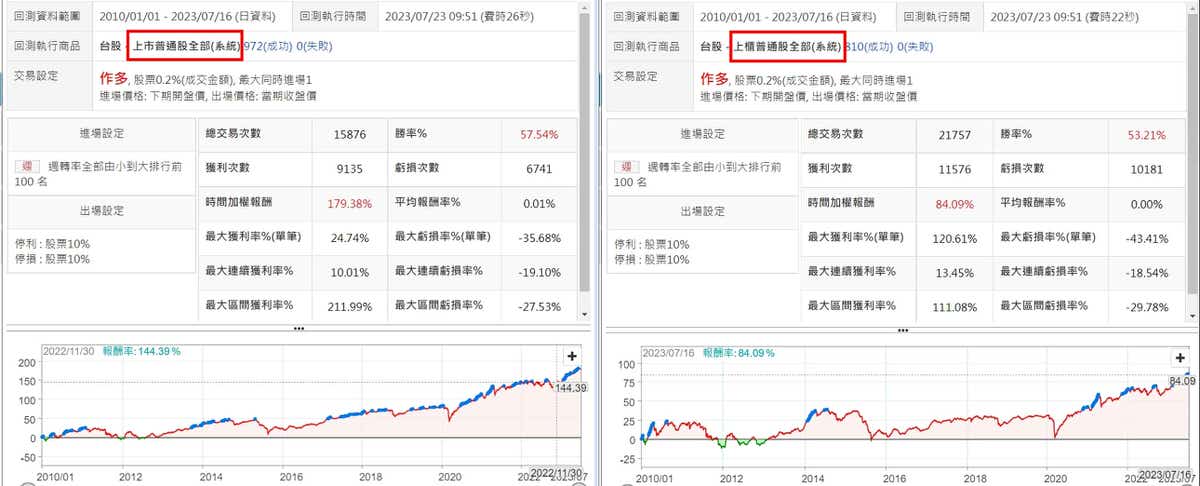 用周轉率由小到大排行前100這個條件繼續做優化,將上市股跟上櫃股分開回測,上市股的績效很明顯的呈現向上的趨勢,