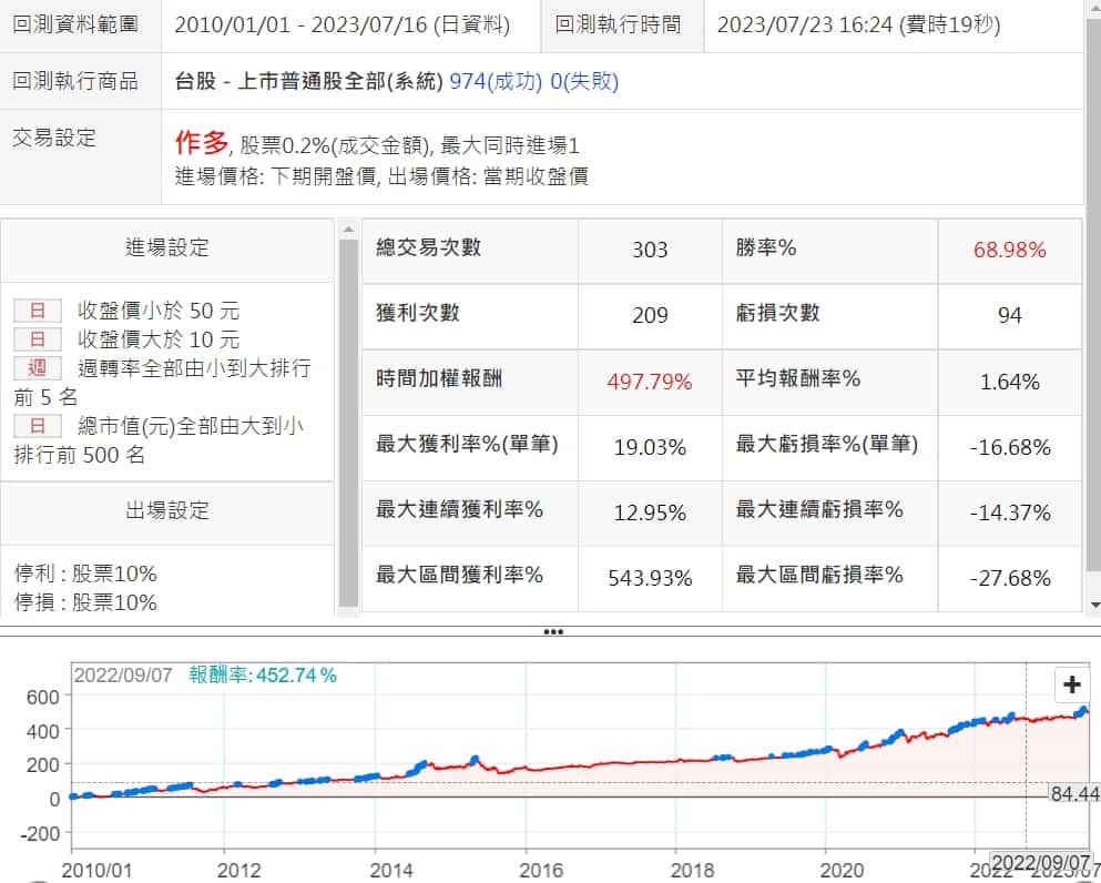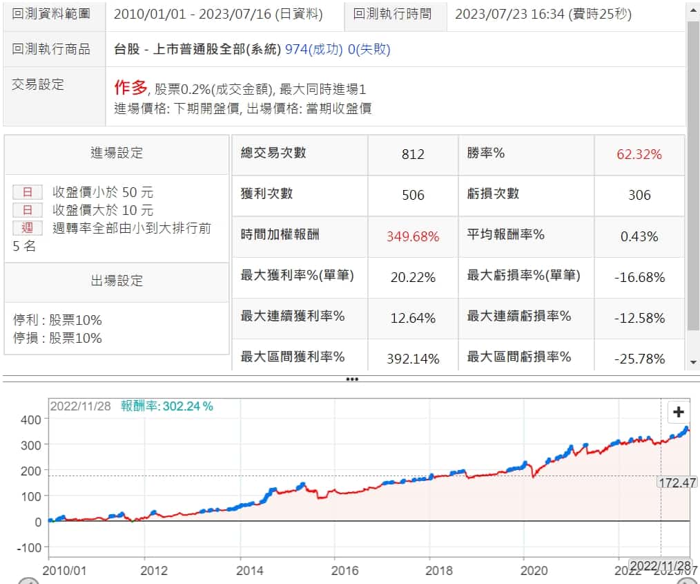 將價格限制在10~50中間,且只選用週轉率排行由小到大前5名,次數降到了1000次以下,勝率達到62.32%,報酬率曲線呈現完美向上,不過,這樣的設定,發現了一個問題,就是選出的股票很多都是成交量非常低的,主要是因為用了小週轉率的關係,這樣的股票,很有可能會有較大的滑價甚至下市的可能