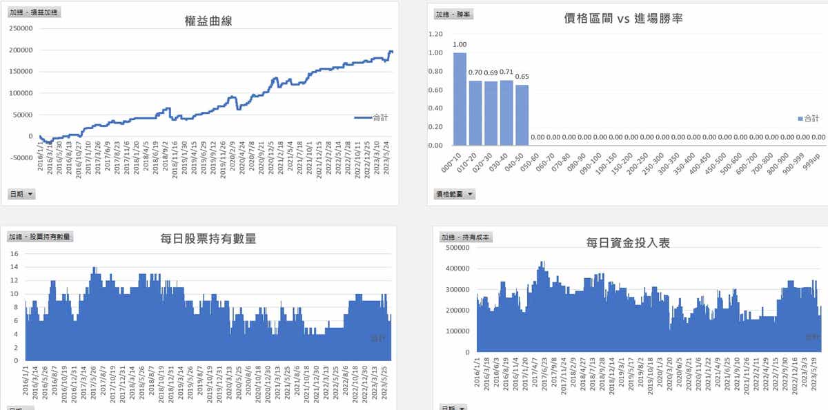 將回測結果匯出複製到A+開發的Excel統計表中,下方左側圖可以看到從2016到現在的權益曲線變化,基本上我覺得已經很不錯的,而從下方右側價格區間跟勝率關係圖可以看出,勝率的分布還算平均,不過這樣的策略市還不能拿來用的,交易次數跟所需要的資金太龐大了