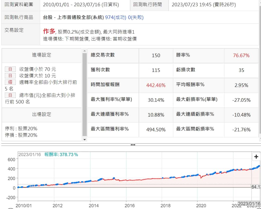 VIP策略,主要是將價格限制在10~70中間,停損利調整為到20%,回測出來的勝率非常高,不過會需要較多一點的資金,約40萬,也需要比較就的時間等待才能獲利出場,讀者可以在調整看看條件,找出更適合自己操作風格的設定