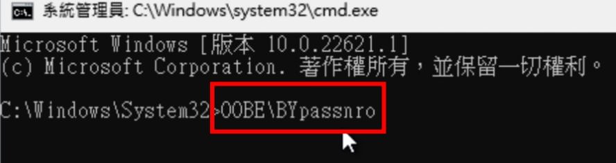 請按Shift + F10或是Fn + Shift +f10,就能看到微軟的命令視窗,到視窗內輸入OOBE\bypassnro,都是英文字,輸入後請按enter鍵,就會重新啟動windows系統