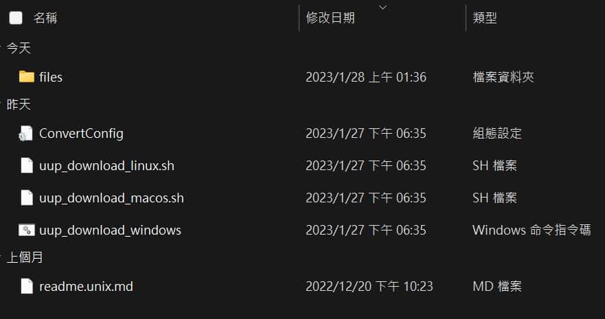 將壓縮檔解壓縮,請確定有將檔案都解壓縮出來,解壓縮之後,會看到下面有幾個檔案,如果你是windows系統,請雙擊uup_downloa_wondows,如果你是Mac,請雙擊uup_downloa_macos.sh檔案