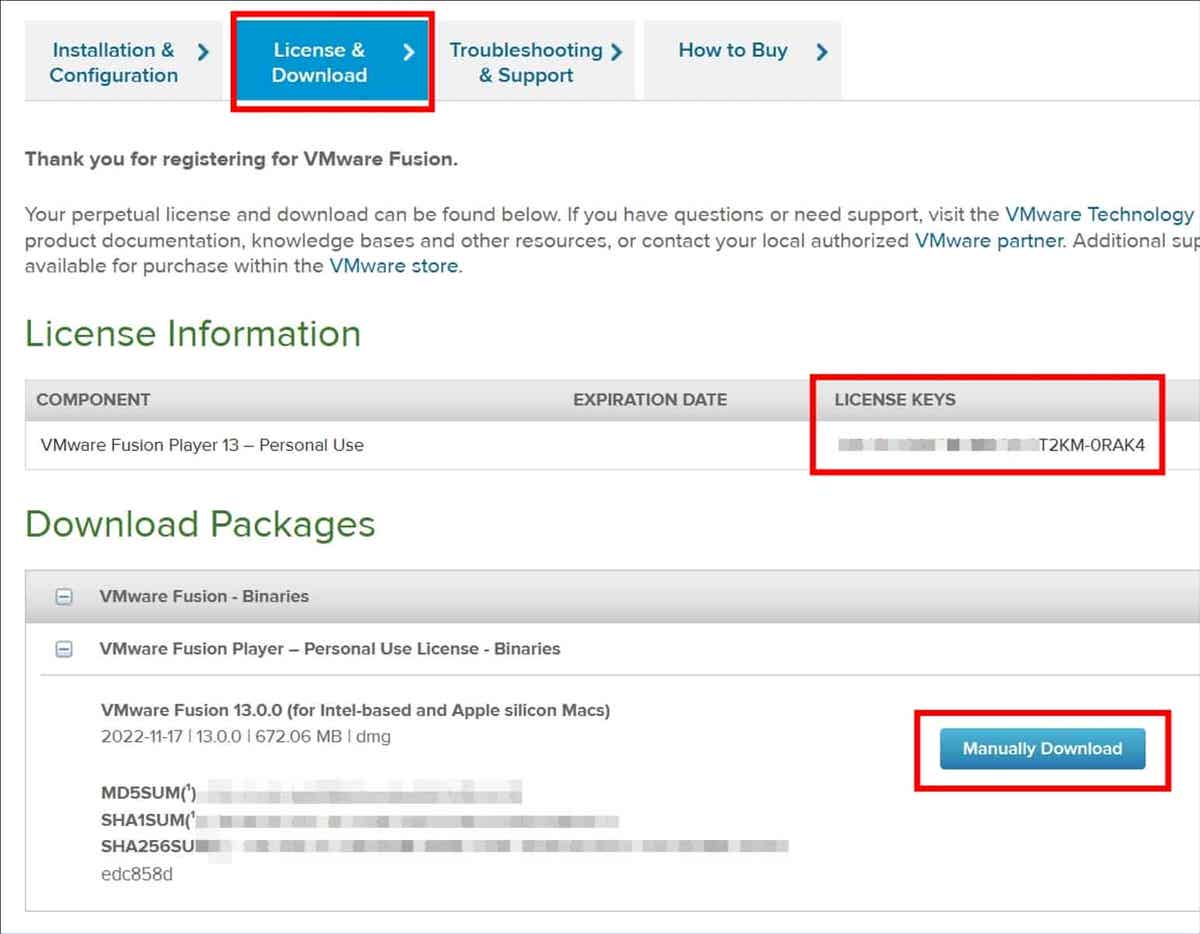 輸入完成後,回到個人版頁面,就會看到如下的畫面,有個人版軟體的金鑰,以及下載連結,記得把金鑰存起來,並下載軟體,到這邊,vmware軟體的取得就完成了