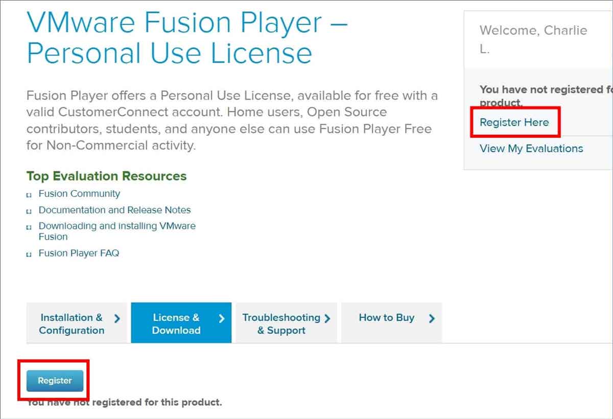 註冊完之後,請先登入customercnnect帳號,然後點這邊取得vmware fustion player個人版金鑰跟軟體,進到網頁後,點下圖任一紅框的位置,申請取得個人版軟體,點擊後,會在進入另一個登記的畫面,需要再輸入一些資料