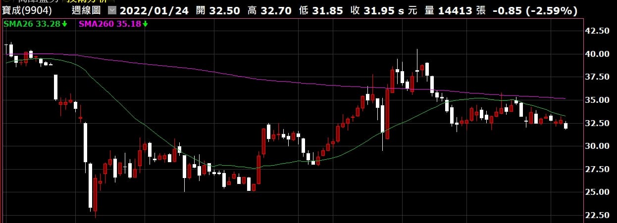 本次採用上一篇的選股方式,以20191121,選出的其中一檔股票寶成(9904)來做回測,這檔股票並沒有列在翁醫師的選股名單內,只是XQ的選股選出來了,且從進場到現在,從來沒有高過進場價,是表現非常差的一檔,就是在20~40區間來來回回,很適合用來看看,在這樣的操作方式下,進場成本能夠降低多少。