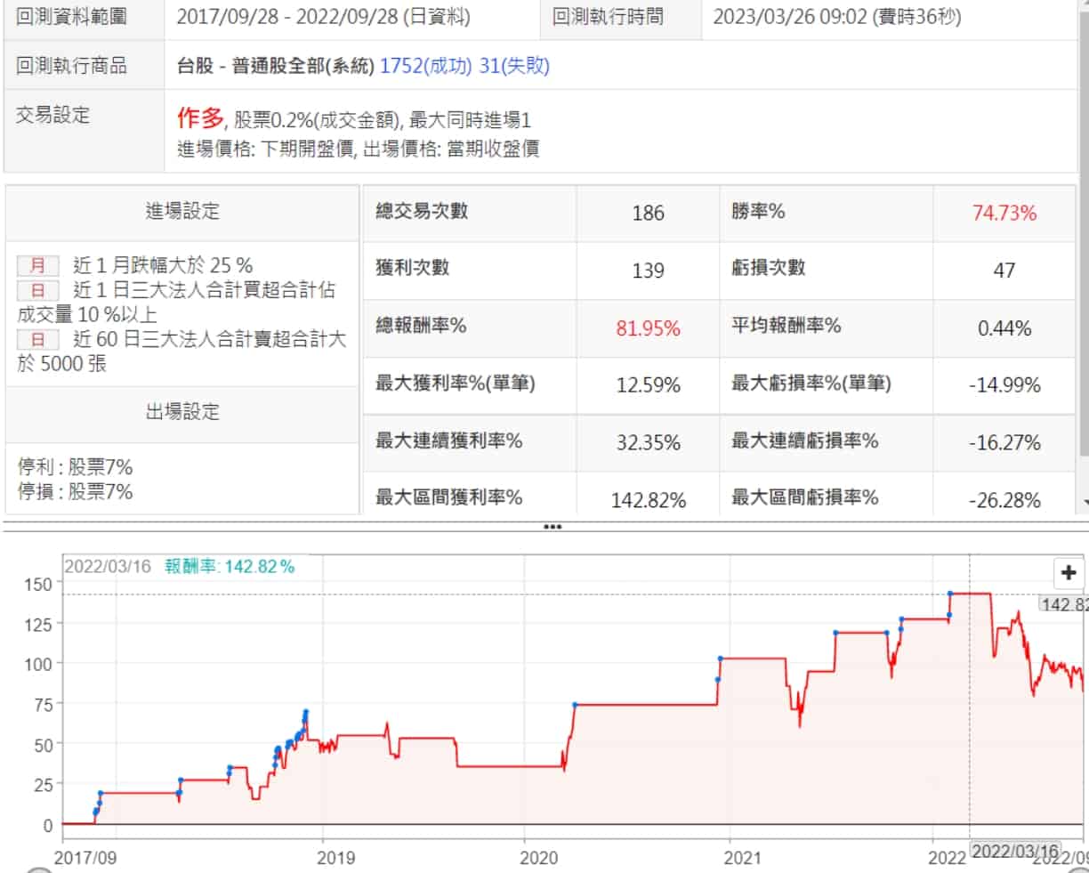- 文章使用 XQ 選股中心對投資者的策略進行回測,結果顯示該策略在長期中的勝率一致在七成以上,但在系統性風險很大的市場中,進場還是很容易中彈,停損出場。