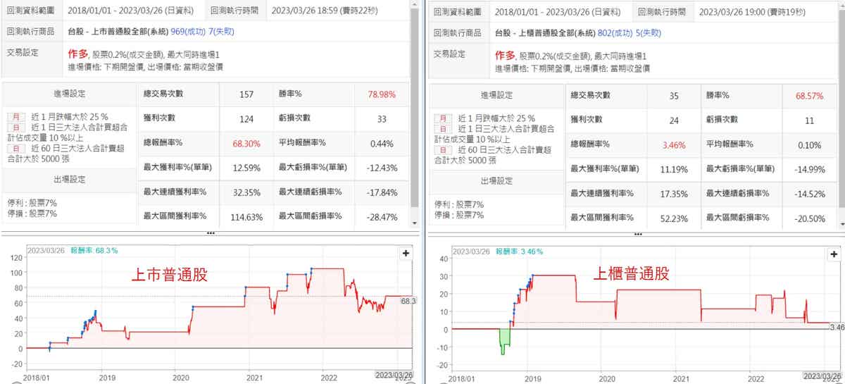 這種策略我不會想要去增加交易次數再去優化,我反會希望能夠降低交易次數,讓每次事件發生的時候不會有過多的股票進場,將上市股跟上櫃股分開回測之後可以很明顯看出,上櫃股的表現是一路的下滑,所以在後面的回測將之採用上市股