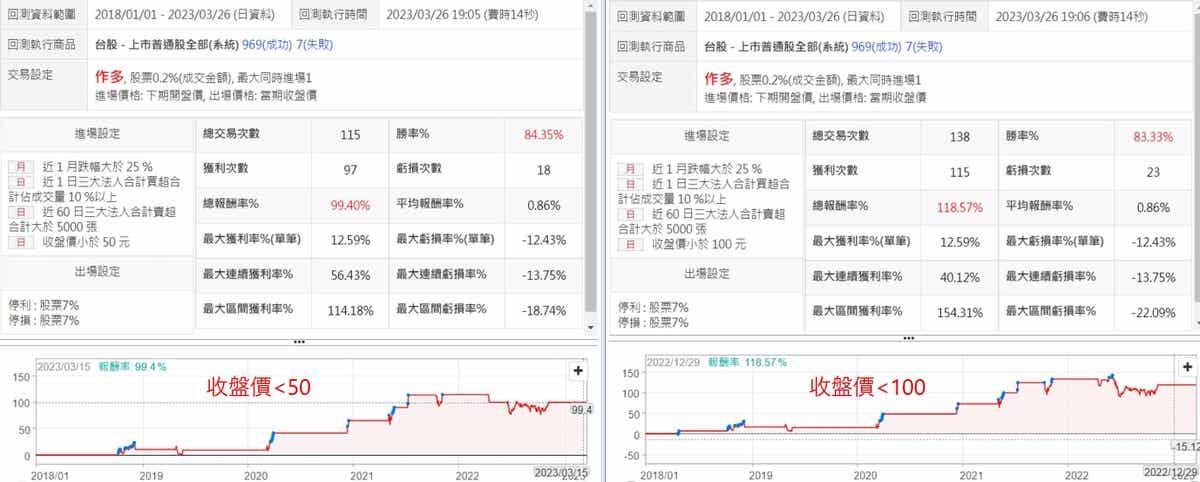 將價格做限制之後可以看出,不管是收盤價小於50或是收盤價小100的條件及回測結果都比之前的好,報酬率都提升到八成以上,而且整個報酬率曲線又更加穩定