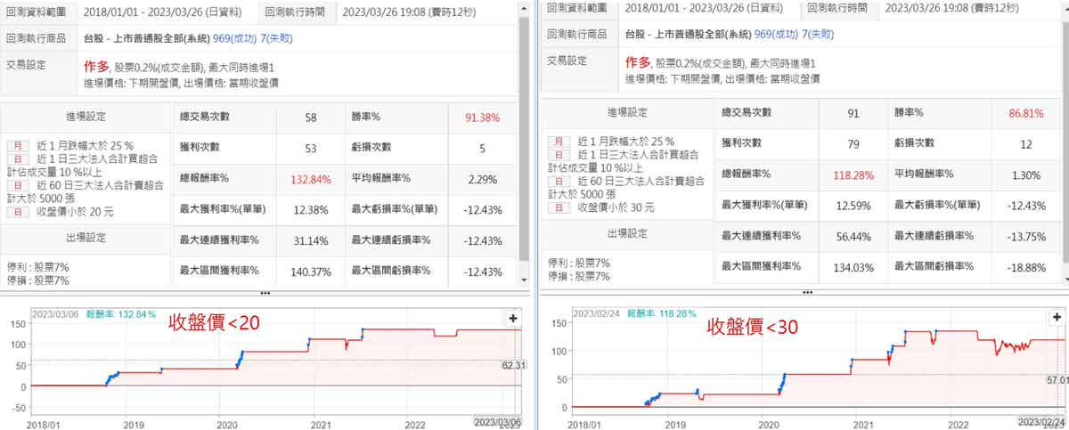 好奇想說來看看收盤價更低的話表現會如何,回測後的績效又更棒了,尤其是收盤價小於20的條件勝率突破了9成,雖然次數少了很多,但這會是我想要的,不會有大量的股票在同一時間進場