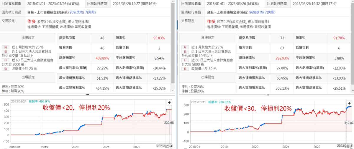 另外這個策略將停損利放大,也不會影響策略的表現甚至還更好,以收盤價小於20,且停損利20%這組條件的回測來看,勝率可以達到95%以上,真的是很不錯了,不過,較另人不滿意的就是2021年中之後到現在的表現較不穩定,不然就完美了