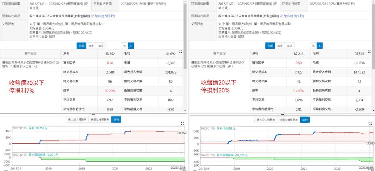 採用收盤價20以下這個條件去比較不同的停損利在交易回測的結果,兩個的表現都算滿平穩的,但以報酬率來說還是以停損利20%這一組是比較高的,五年報酬率接近60%,而且最大投入資金並沒有比停損利7%這一組高太多