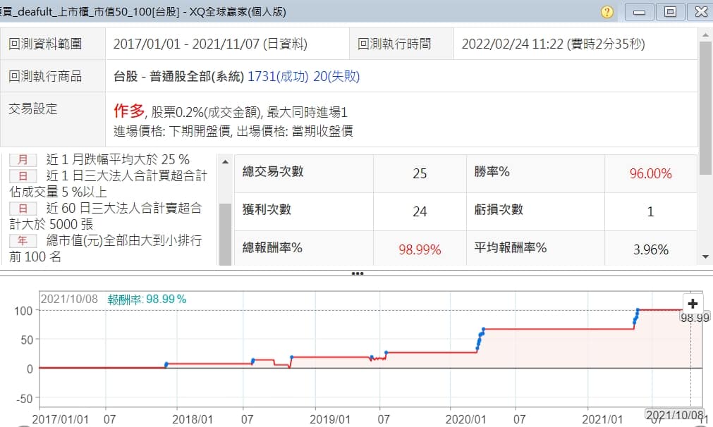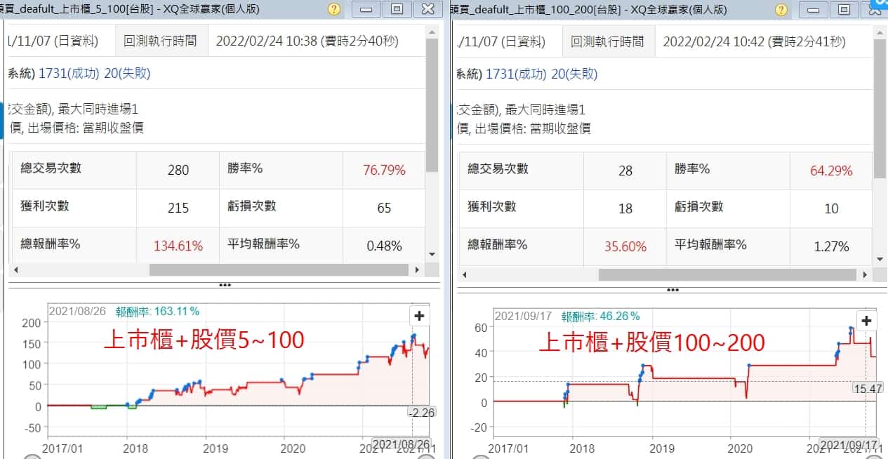 當把價格限制在100以內,且市值為前100大時,勝率也可以超過9成,對於資金不多的朋友,這個反而會是比較好的選擇,回測3雖然勝率高達96%,但有不少的股票價格是超過150以上的,如同時要買兩檔以上,資金需求就會比較大了