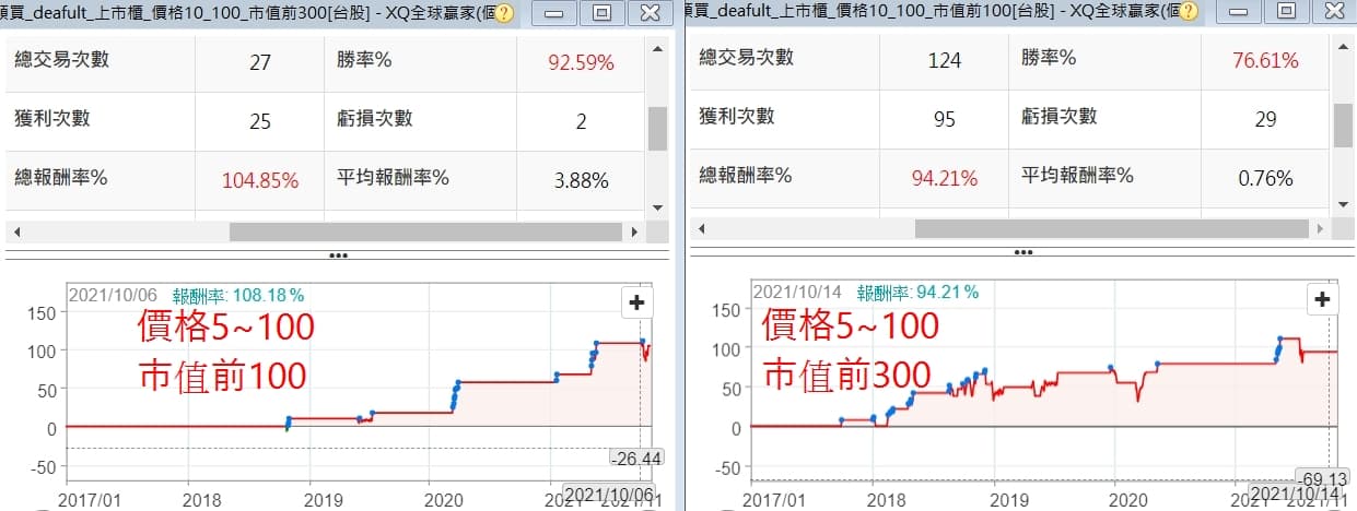 另外,如觀察市值50跟100的圖表可以發現,當市值從50增大到100時,交易次數從22次增基到47次,虧損次數僅從8次增加到9次,表示虧損僅增加了一次,表示,如果把市值限制在50~100,那勝率不就是96%!!!!( 1-(9-1)/(47-22)=0.96 )