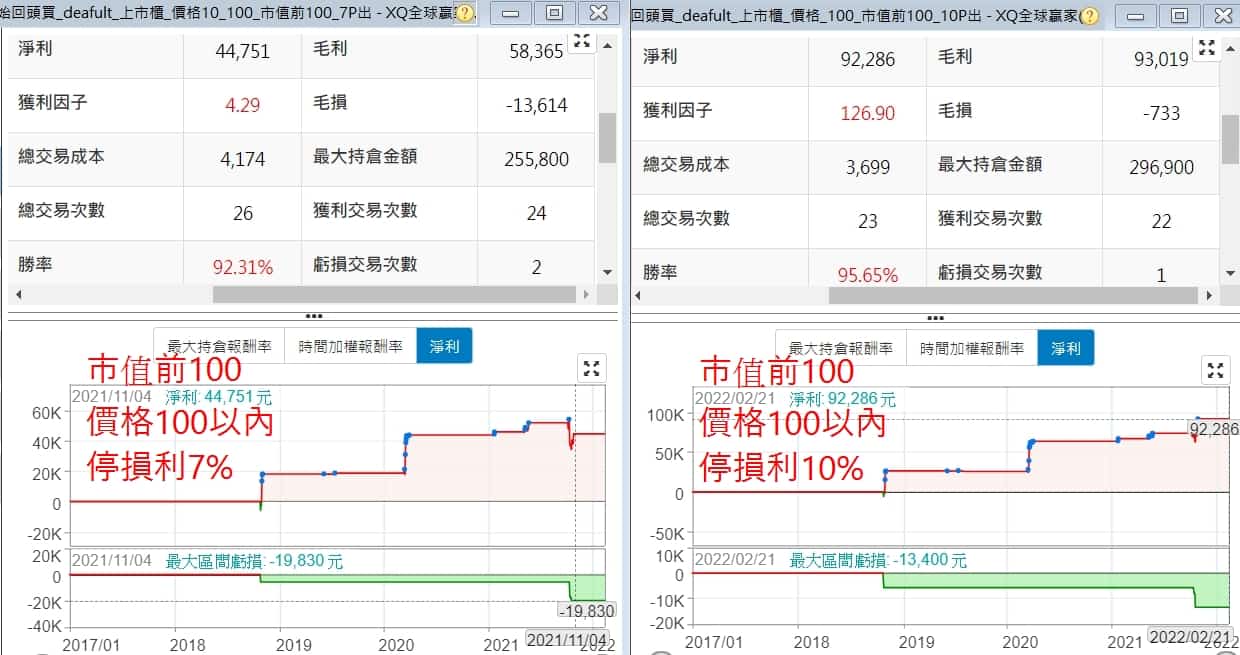 交易回測的篩選條件,採用選股,並限制在價格100以內的股票,當停損利從原本的7%提高為10%的時候,勝率也跟著提高到95.65%