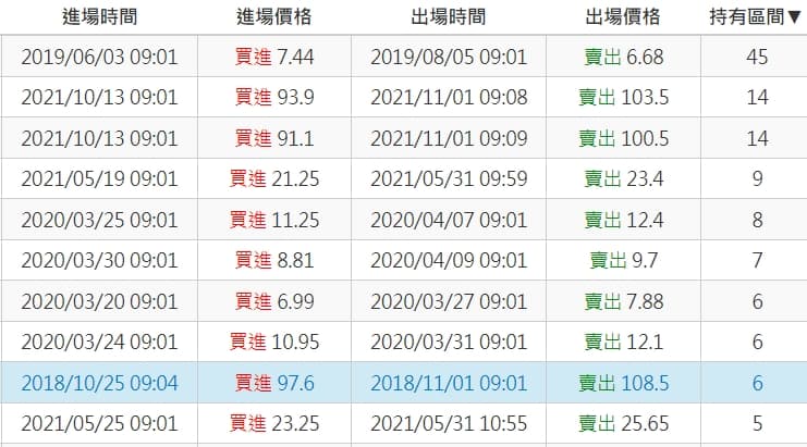 這個策略的優點在持有區間不長,以持有區間排序,最長就45天,但大多14天以內就出場