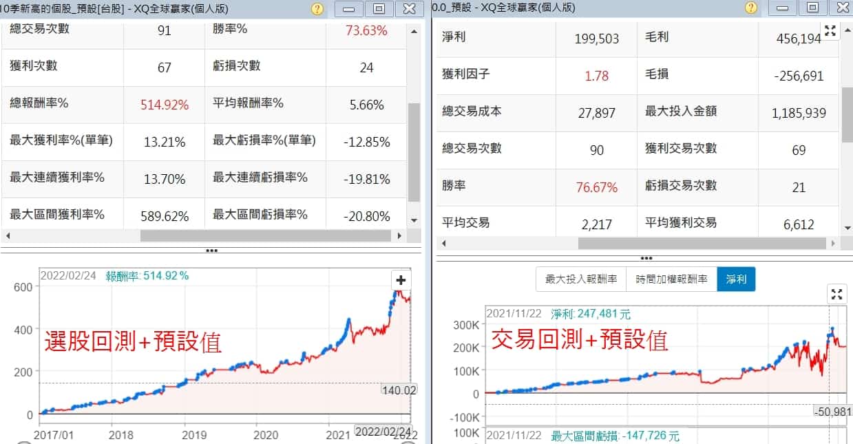 用預設值+上市股票+停損利10%,做了選股回測,發現績效很不錯,就直接用交易模組回測(右圖),淨利也算是一路往上,但在2021/5月後淨利大幅下跌震盪,雖然後來還是往上,但看起來就不是很爽