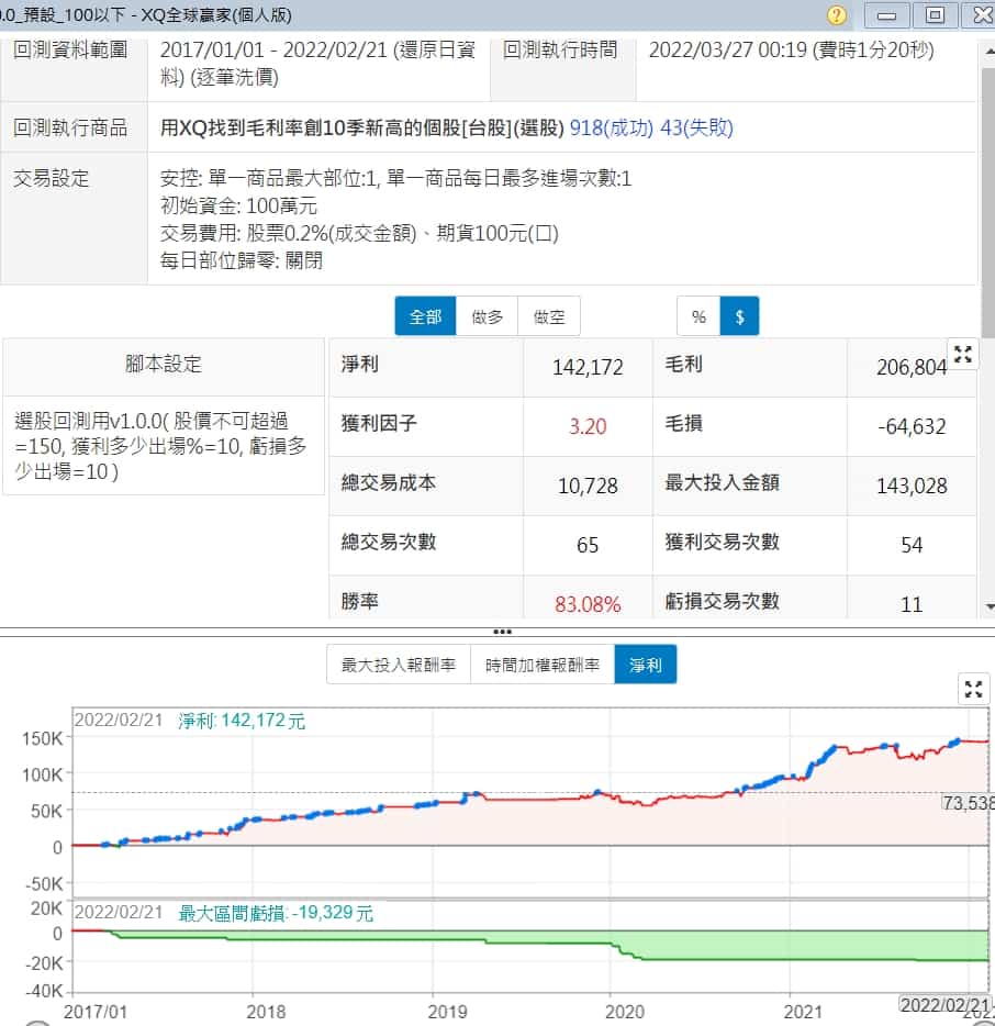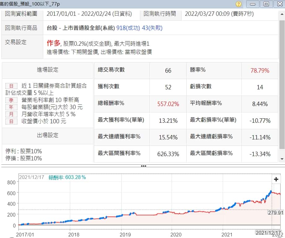 這次加上了價格限制在100以下的股票,就這麼一個改變,選股勝率從73.63%爬升到78.79%,報酬率看起來也穩定多了