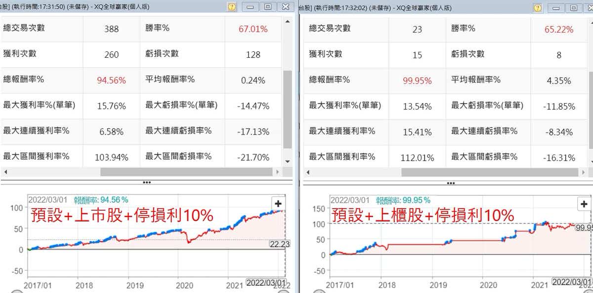 用預設值分開測試上市櫃的績效,發現上櫃股的次數非常少,基本上可以忽略上櫃股,以下僅用上市股回測