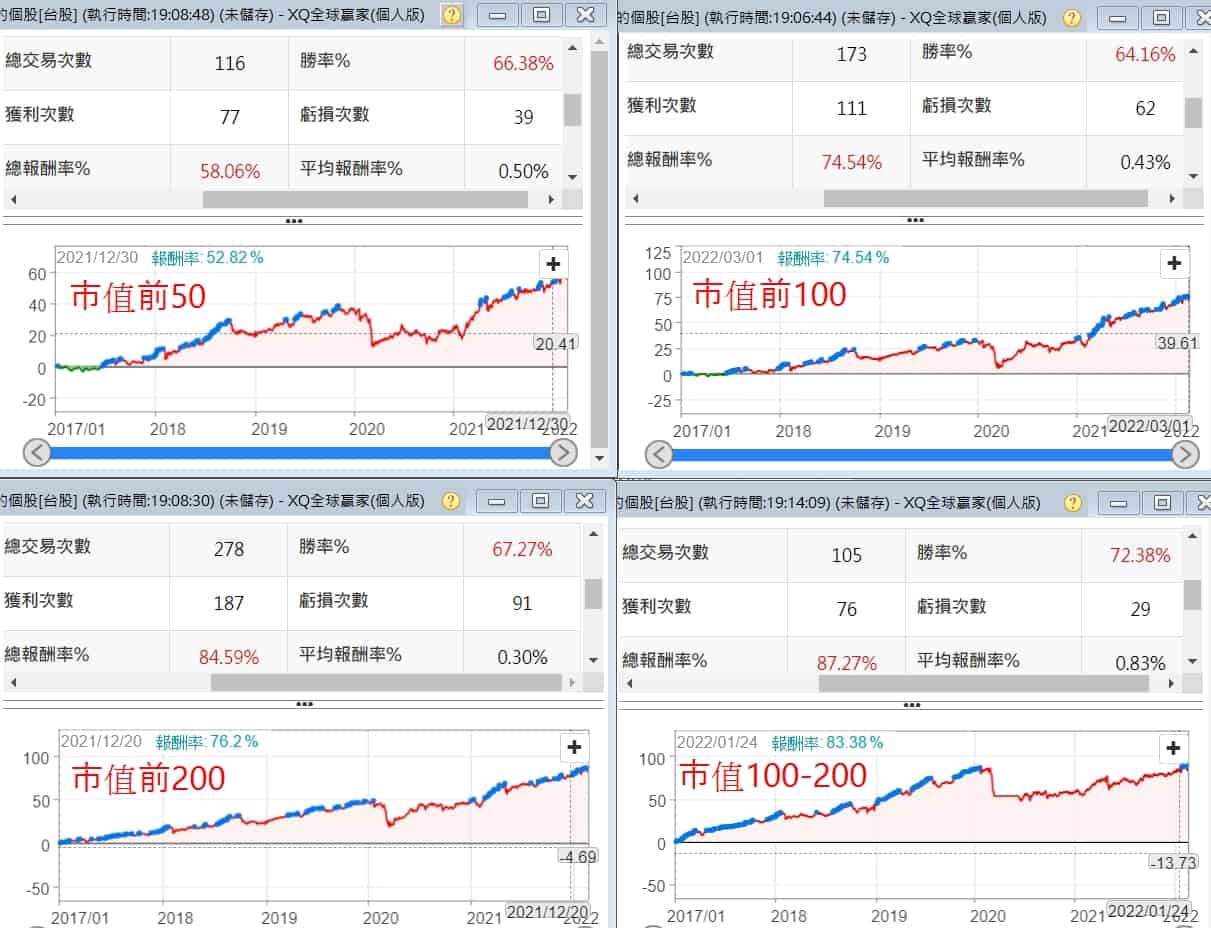 單純地用不同市值排名比較,勝率跟原本沒用的時候差異不大,不過當市值介於100~200的時候,勝率可提高到七成以上。