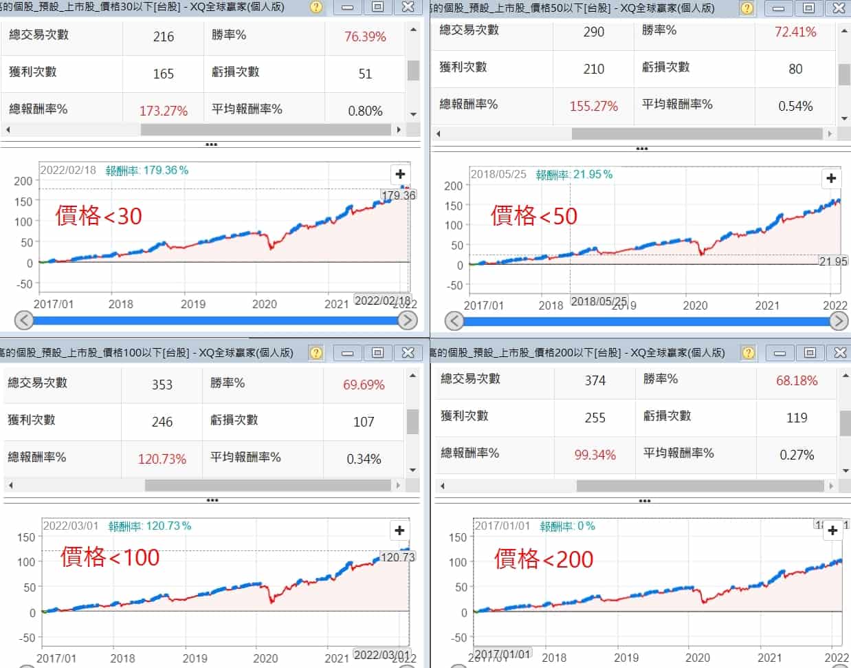 前陣子用超低價格回測常到甜頭後,現在都一定要試下低價股的回測結果,果不其然,這次的回測,價格低於30的股票回測勝率最高,將原本67%的勝率,提高將近10%到76.39%,會不會太猛啊