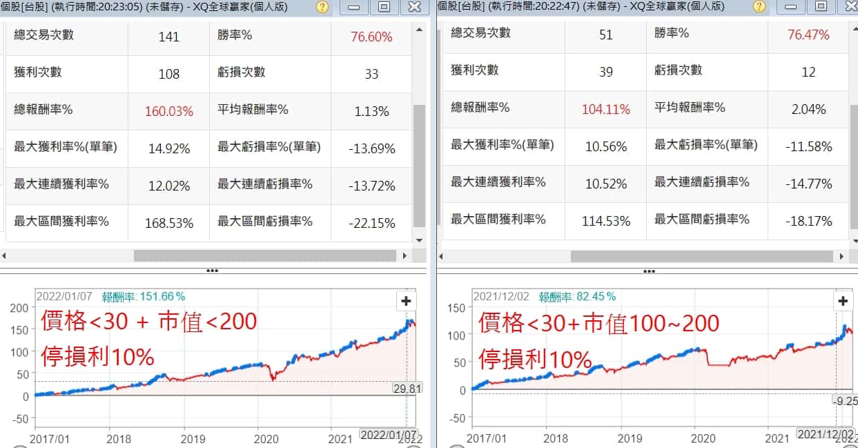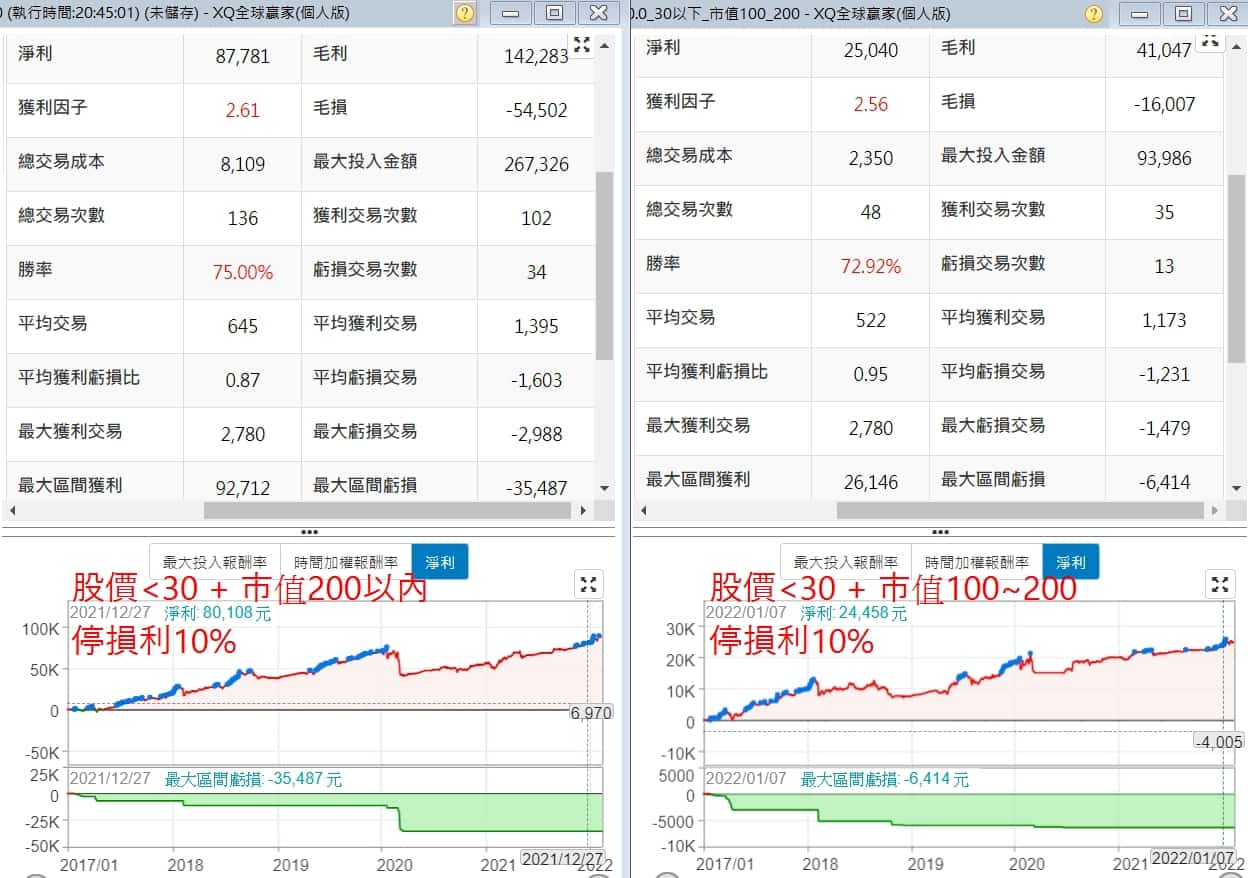 測完價格跟市值後,當然要相加一起看看,跟只用價格小於30的條件比較,勝率都差不多,不過次數少了許多,對於市值的使用,我會盡量保留,畢竟購買高市值的股票,至少是比較安全些,不會突然就下市