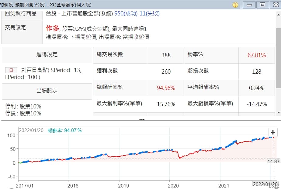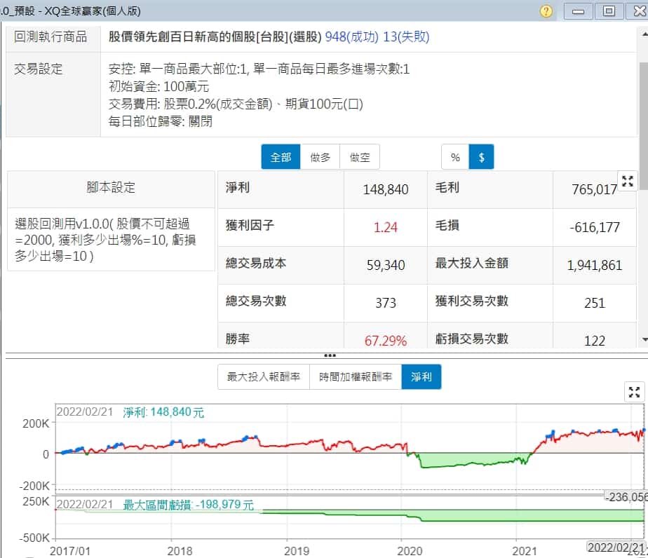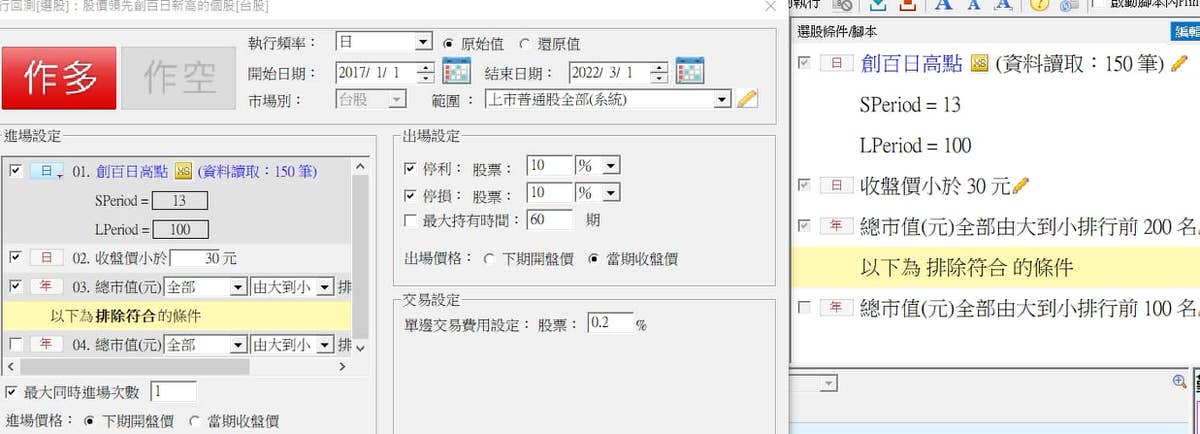 XQ的股價領先創百日新高策略,回測後發現很適合在多頭市場中操作,勝率可以非常的高,但似乎是因為創高,進場後想要獲利出場,就會需要等較長的時間,而這就會有個劣勢,遇到崩盤時,可能會手邊還一堆股票,被停損出場,因此,將策略調整為只交易市值前100大的,遇到崩盤,對於想要持有的人,也才能較為安心。