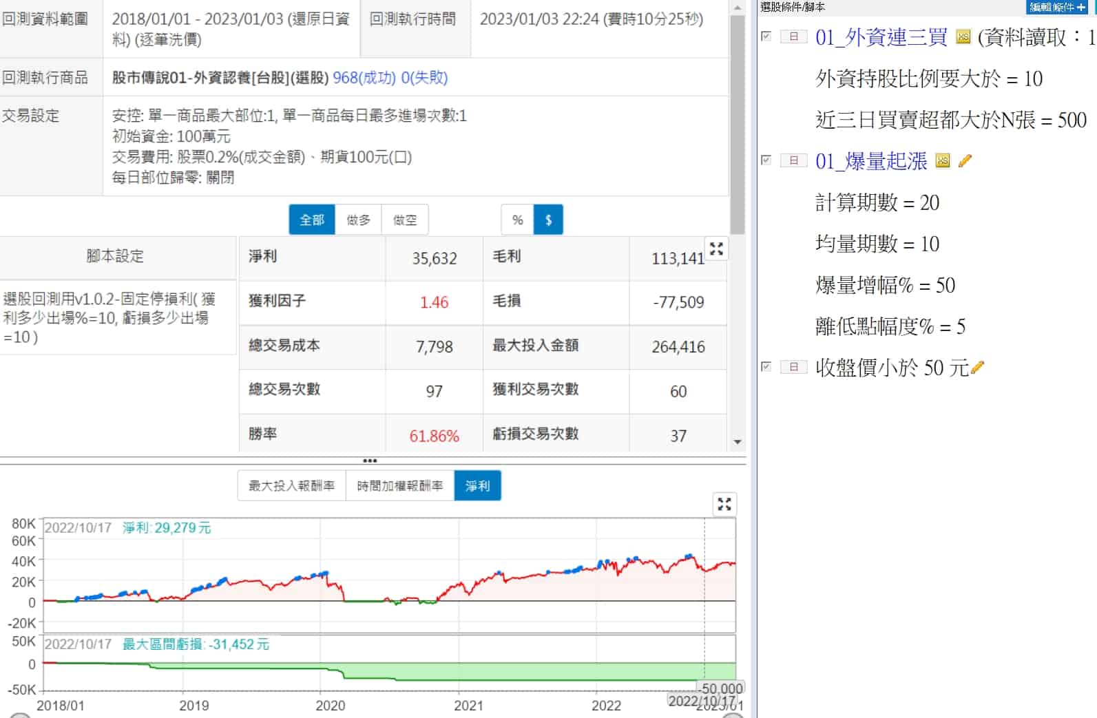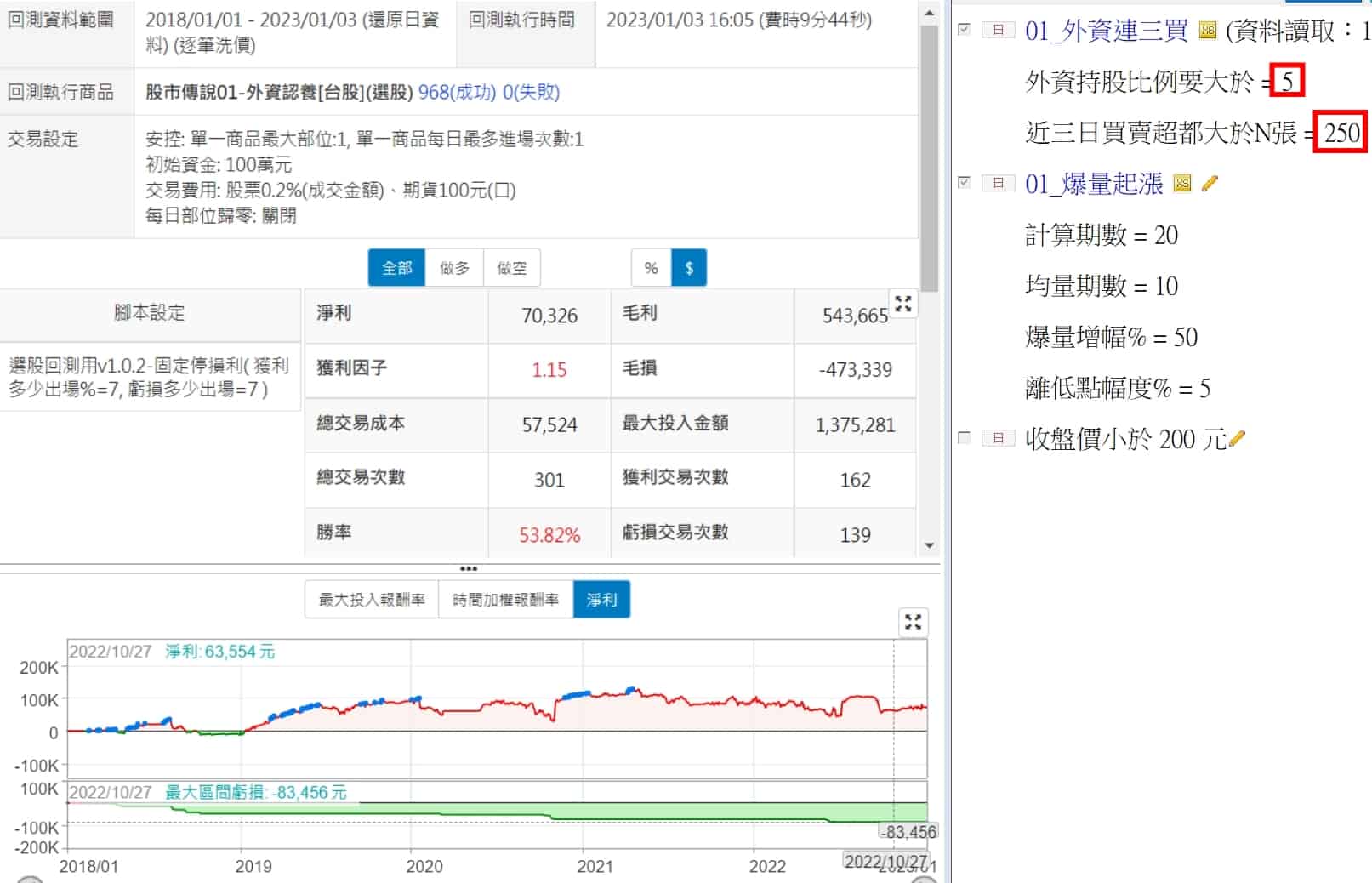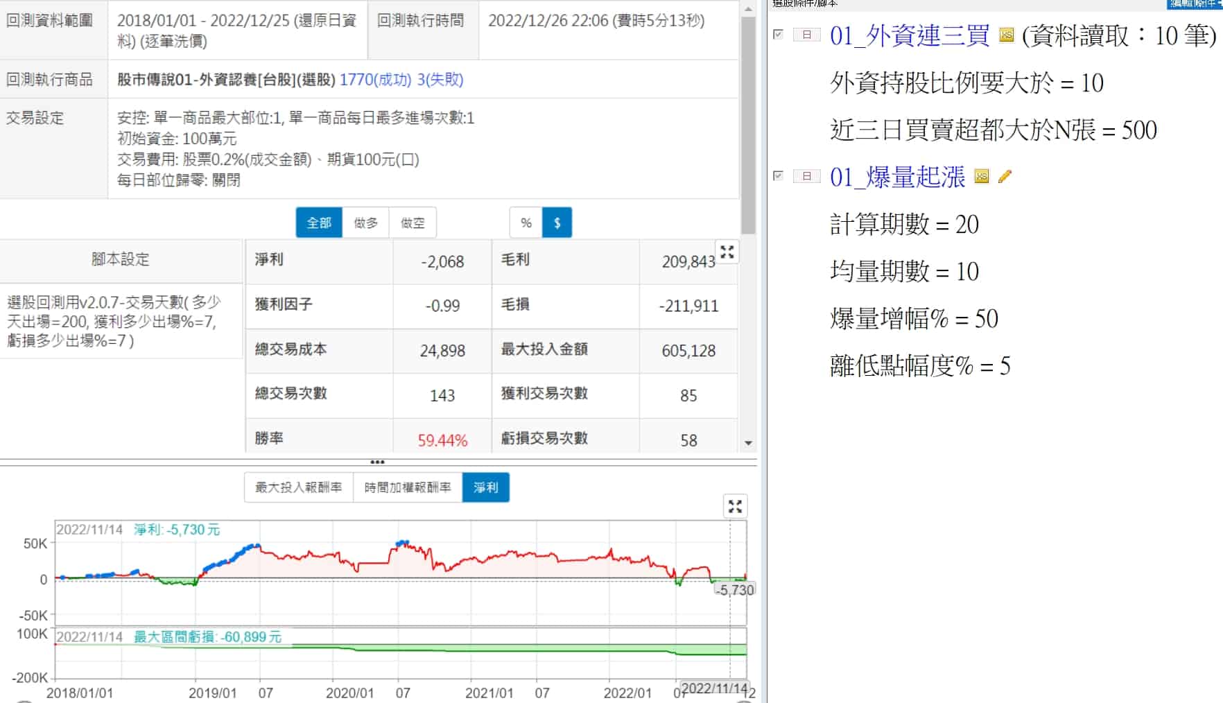 放寬外資連三買的參數,讓交易次數增加,避免後面的回測次數會太少,調整後,回測出來結果比上面的好,2022年的還沒啥虧損