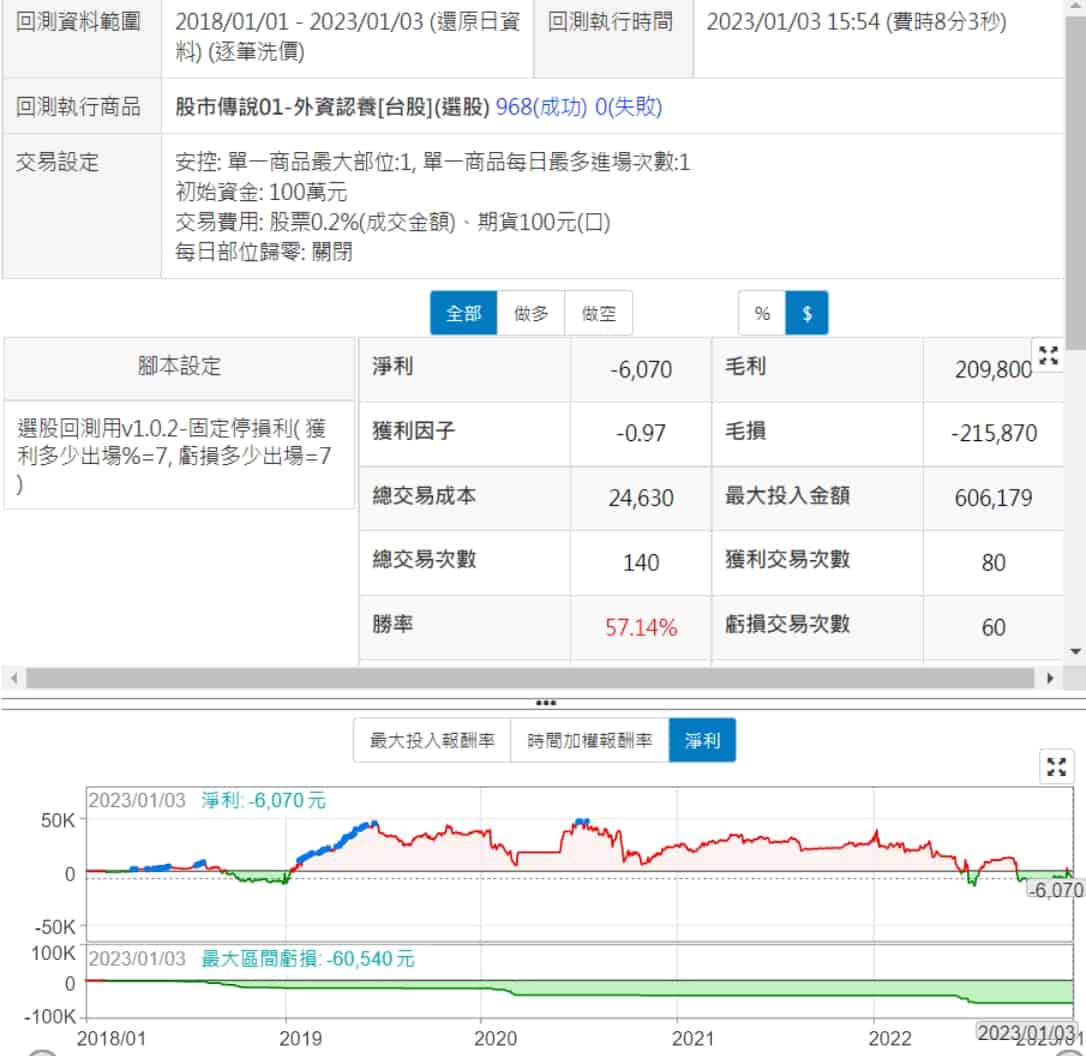 採用預設值回測,停損利7%,回測結果在今年的表現不是太好