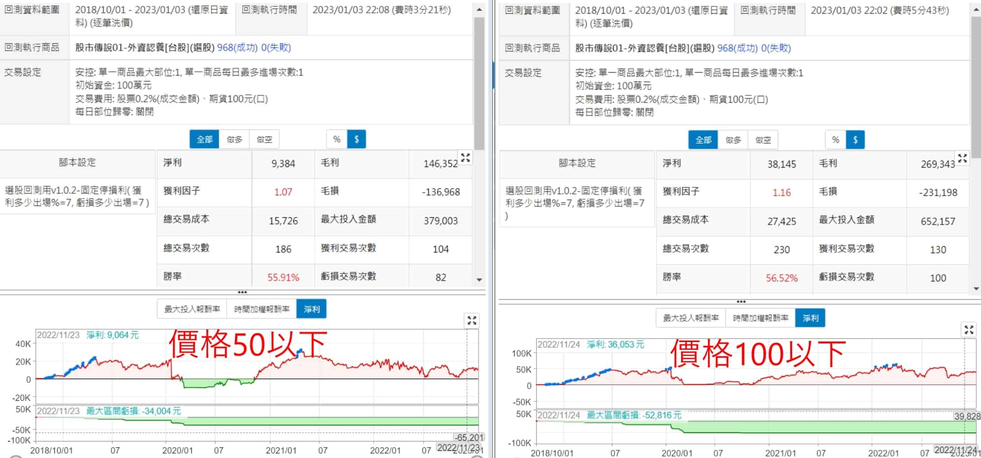 測試50跟100以下價格區間做回測,出來的結果似乎都不是太好,