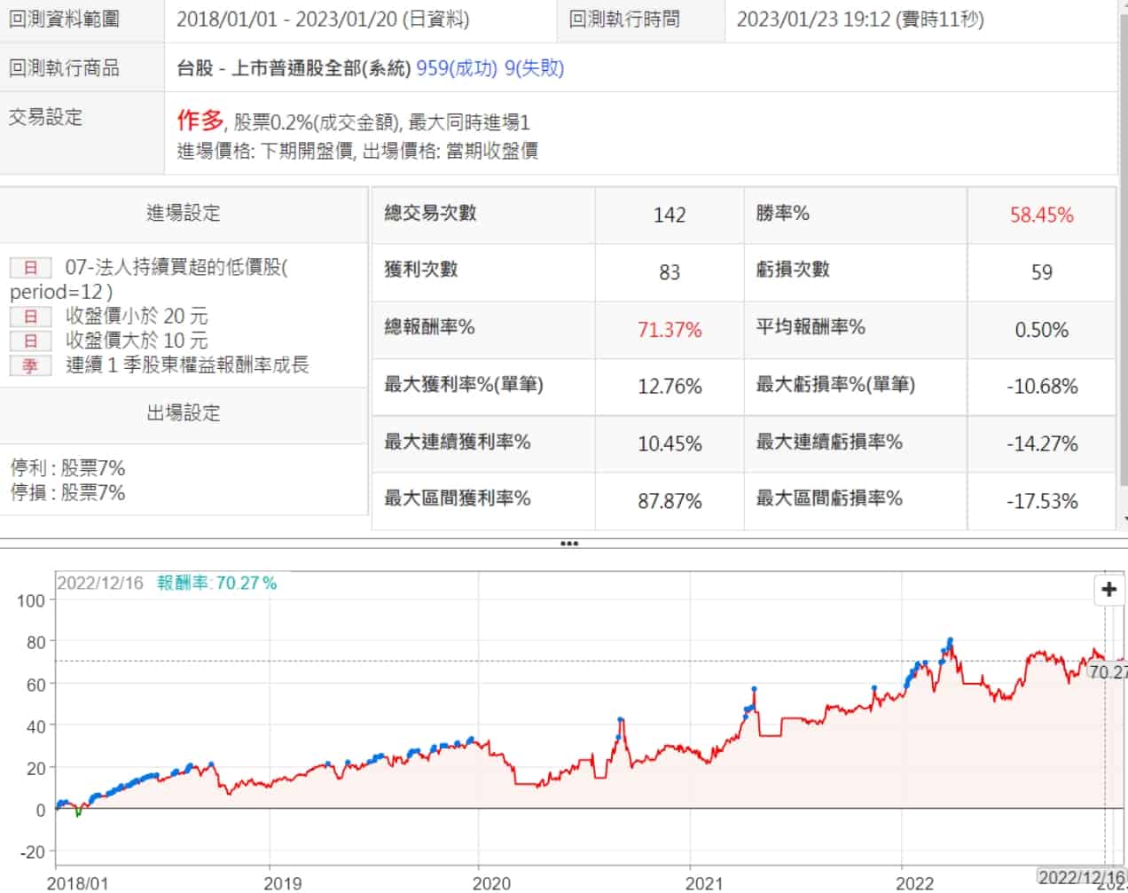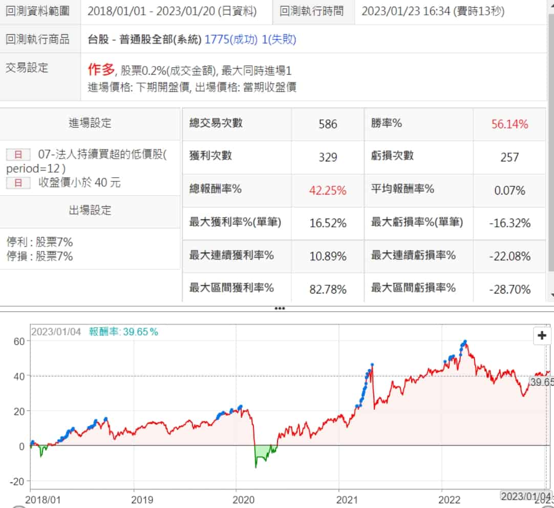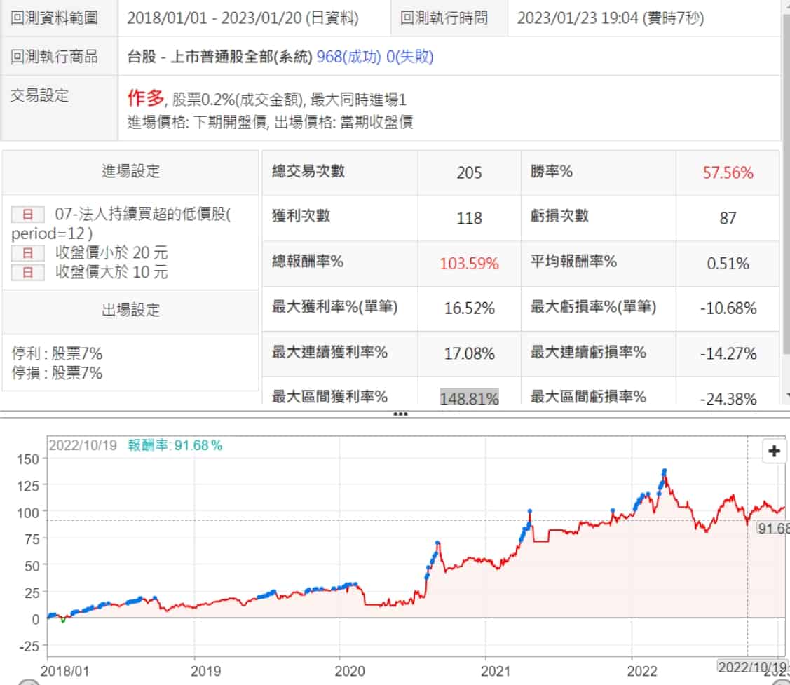 優質低價股策略一直是我比較喜歡的,XQ提供的法人持續買超的低價股策略就很符合我喜歡的策略類型,優化之後勝率接近八成,而且績效穩定,2022年還是賺錢的,很值得看看