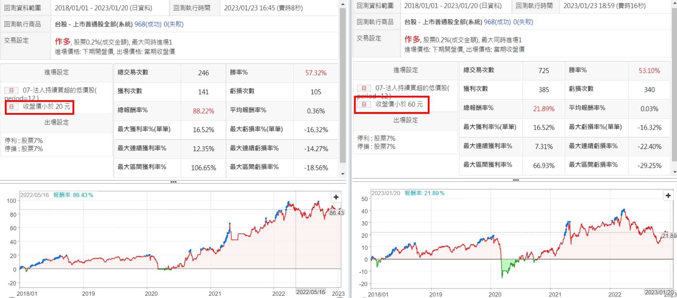 將價格設定在20以下及60以下分開回測,可以明顯看出價格在20以下時,表現較佳,勝率跟報酬較高、MDD較小