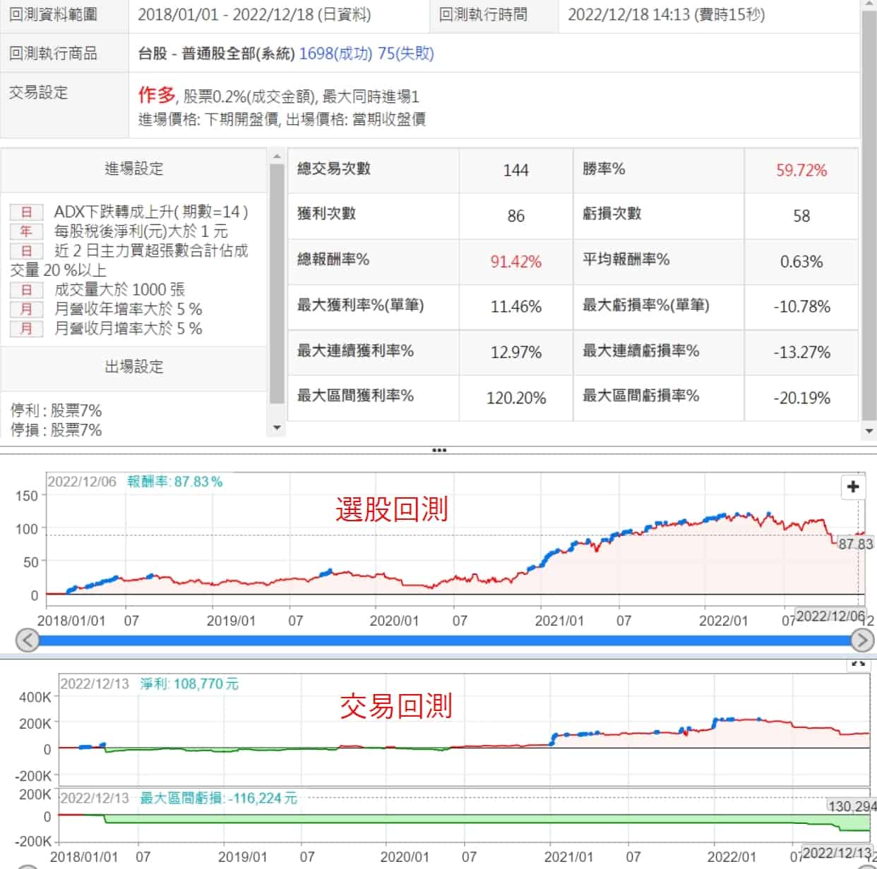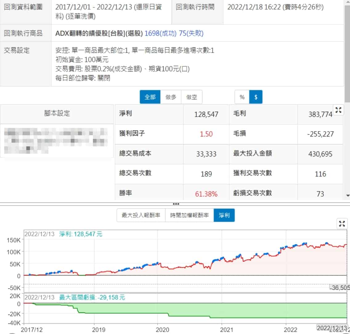 XQ的這個ADX翻轉的績優股策略,是將技術指標、籌碼面跟基本面都結合在一起做判斷的一個策略,這個策略過2020年前的表現平平,經調整後,績效表現較為平穩的一路往上,不過,2022年未獲利,需要再觀察
