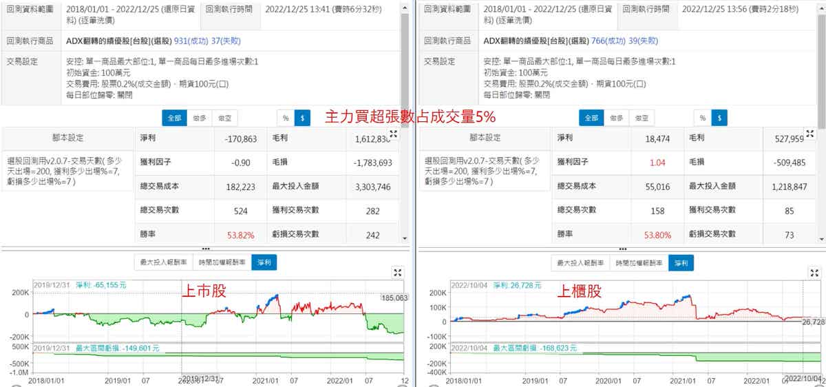 由於原本預設的交易次數有點少,因此將近兩日主力買賣超總量大於10%降低為5%,並且用上市櫃分開回測,回測結果可看到交易次數增加不少,上櫃股似乎表現較好,但近兩年也表現平平,因此,後續回測,暫時先將上市櫃一起回測