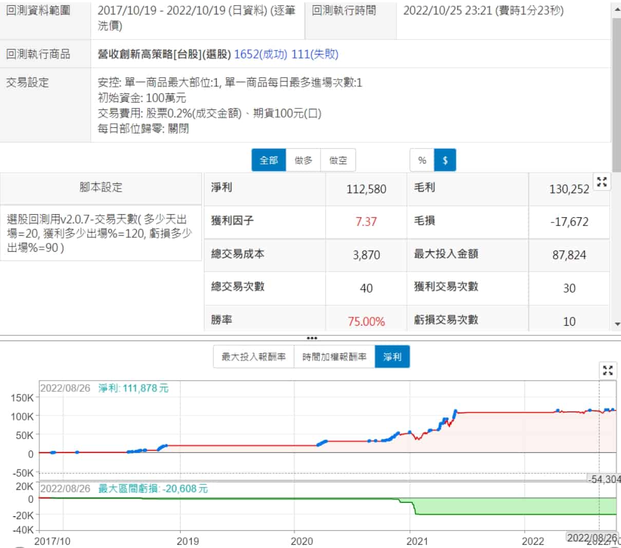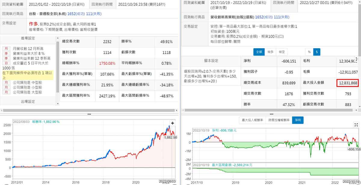 調出了一個10年選股報酬率達到1750%的策略,比原本文章的還要高,但用交易回測最近五年,績效就有點慘了,不只是負的,最大投入金額還要1200多萬,不過,我的參數跟原文章的參數肯定不同,原文用交易回測的績效說不定是很漂亮的