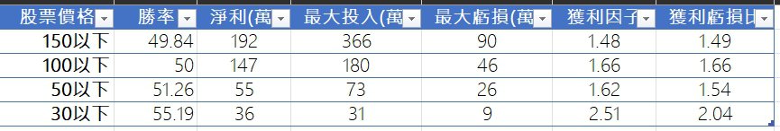 下面的比較表可以看的更清楚,勝率、報酬、獲利因子這些,當限制的股價越低時,績效越好,尤其是股價限制在30以下時,五年的報酬超過116% (淨利/最大投入),等於一年報酬有23%了,不過,看淨利曲線獲利是集中在2020跟2021這兩年,如能提升其他幾年績效會更好