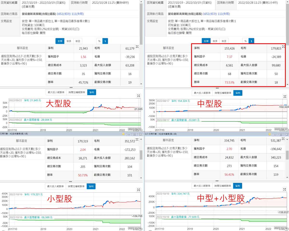 公司類別為XQ內建的選股條件,分為大型股、中型股、小型股,將這三種類別分開回測,價格還是限制在30以下,採用中型股的時候,績效有點嚇人啊,本來勝率都只有50出頭,一下跳到73.53%,淨利15.5萬,最大投入只有10萬,等於五年報酬率150%,是不是很猛,不過就是交易次數少了點