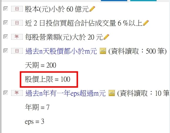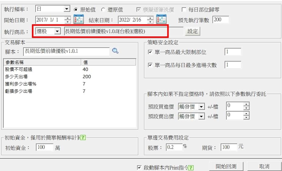 選股策略的設定,基本上都跟XQ是一樣的,只有股價上限調為100,但在交易程式碼,會再篩選一次價格,另外,商品請選用上市普通股全部,如選用上市櫃普通股全部,用交易程式碼回測長跑不出來。