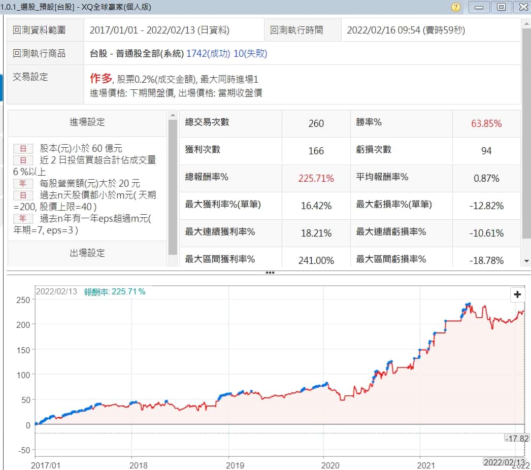 整個回測過程,並沒有調整過多XQ原設定數值,只有調整了最高股票價格、停損利區間,並增加了出場天數的限制,整個獲利就能表現的更為穩定,勝率雖沒有提升太高,約64%,但感覺是更可使用的策略